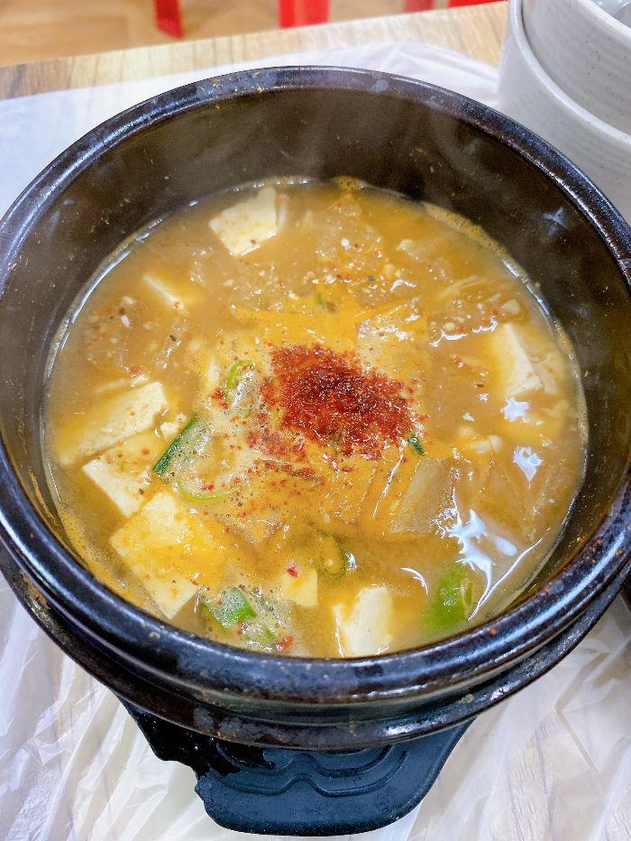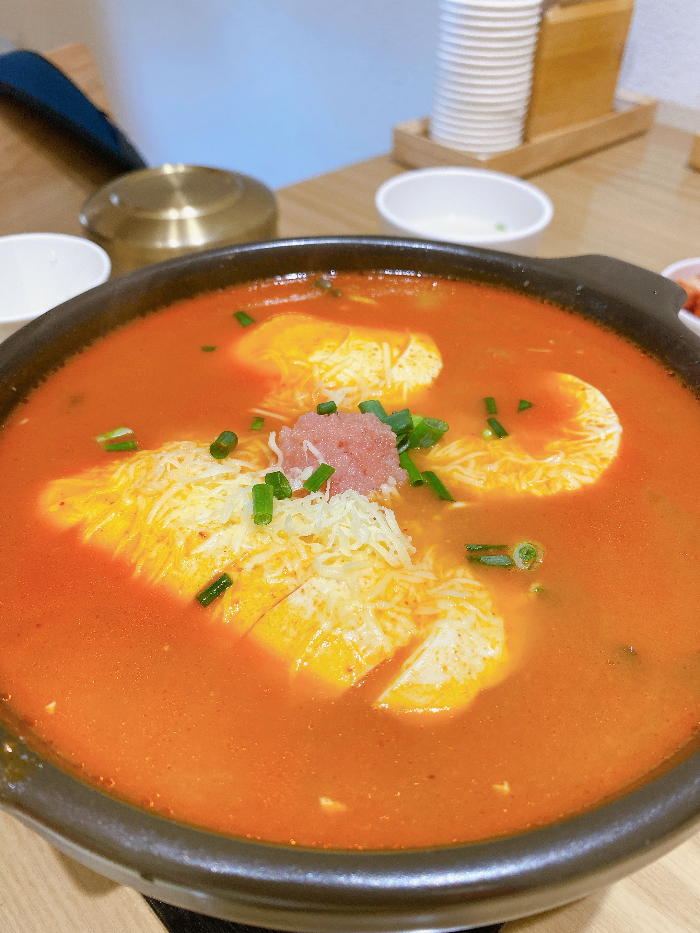 안에 치즈가 들어 있어서 많이 맵지 않고 맛있게 먹을 수 있는 순두부찌개였습니다.