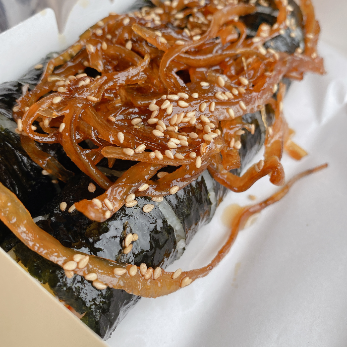 우엉김밥이라 김밥 안에 우엉이 많이 들어 있나? 하며 주문하였습니다. 간장에 달콤하고 쫀득하게 조린 우엉이 얹어진 김밥입니다. 우엉을 정과로 만든 느낌!! 교리 김밥이랑 비교하면 요게 더 생각이 나는데.. 같이 먹을 만한 국물 메뉴가 없어서 그게 아쉽더라고요.