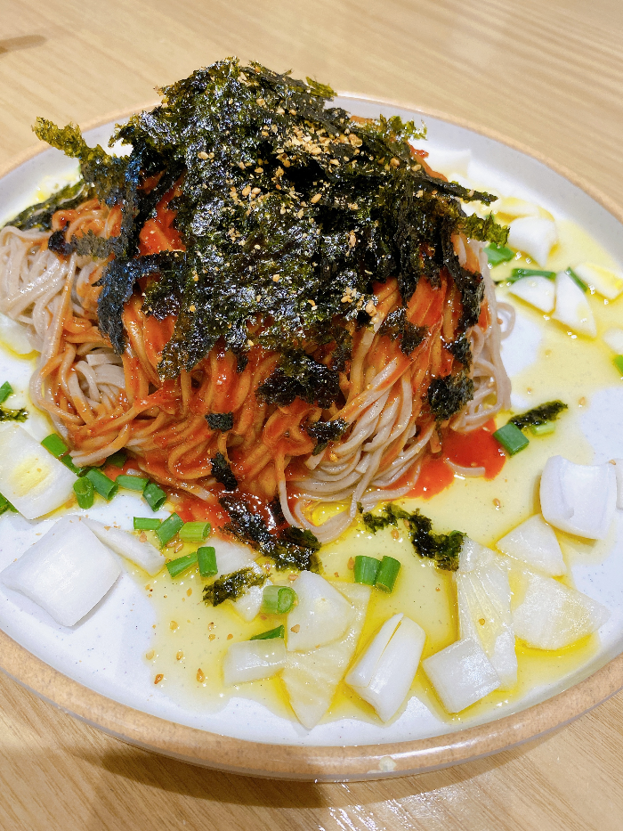 저희는 명란 치즈 순두부, 들기름 비빔 메밀국수, 새우 치즈 감자전을 시켰습니다.