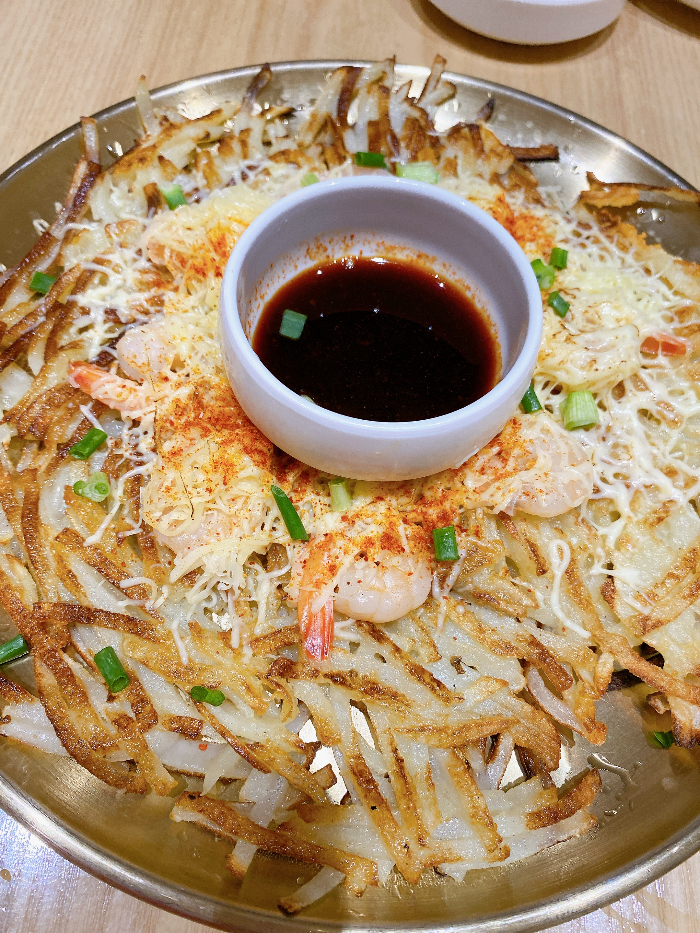 갈아서 만든 감자전이 아니라 채 썰어서 만든 감자전이었습니다. 치즈까지 더해져서 고소하고 바삭하고 난리네요.